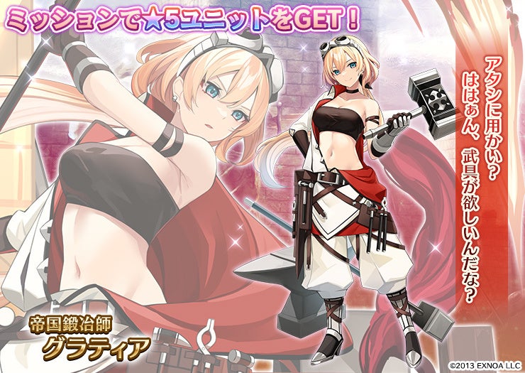 また交換所にて、ミッションで集めた特定のアイテムを交換することにより、期間限定で帝国ユニットの育成に役立つアイテムや、レアリティプラチナの鍛冶職人『帝国鍛冶師グラティア』が手に入ります! ぜひ、仲間にしてください!