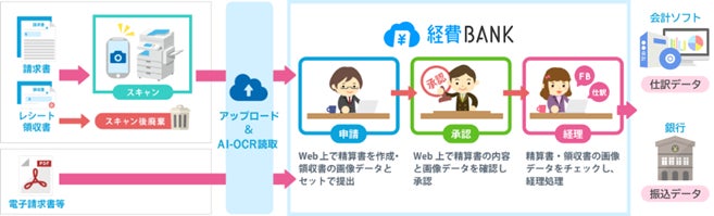 「経費BANK」は、Webブラウザで月額1,500円から利用できるクラウド型経費精算システムです。スマートフォンやタブレット端末で、いつでもどこからでも申請や承認ができる上、取引先への支払依頼と支払予定表による支払管理、経費集計による経費分析、銀行振込データ及び会計仕訳データの作成機能により、経理業務効率化を実現します。