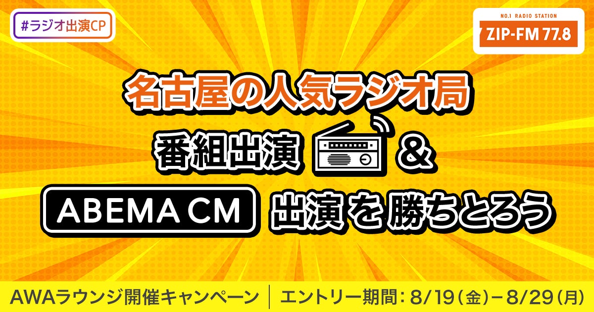 本日よりエントリーが開始された『誰でも参加可能!名古屋ZIP-FMのアシスタント・ナビゲーター権 & ABEMA CM出演権キャンペーン』は、LOUNGE(ラウンジ)の音声ライブ配信機能を使用した配信者を対象に、10月16日20:00にZIP-FMで放送される『SUNDAY NIGHT SPECIAL FIND THE FUTURE HITS with AWA』へのアシスタント・ナビゲーターまたはゲストで出演できる権利を贈呈する企画となります。また、番組出演以外にもABEMAのCM枠で放送されるAWAオリジナルCMへの出演権もご用意いたしました。AWAの配信者であればどなたでもエントリーは可能となりますので、ぜひ本キャンペーンに奮ってご参加ください。
