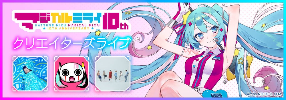 「マジカルミライ 10th」開催を記念し、「マジカルミライ」のイベントテーマソングを手掛けてきたクリエイターたちが出演する、オンライン限定のスペシャルイベントを実施! 出演するのは、kz (livetune)、ピノキオピー、有形ランペイジ(sasakure.UK)〈※敬称略・順不同〉。国内外に向けて「PIA LIVE STREAM」で8月31日(水)19:00から配信を行い、9月1日(木)18:00~9月5日(月)18:00までアーカイブ配信を行います。視聴チケットは1,000円(税込)、8月18日(木)11:00から販売いたします。視聴対象地域などを含めた詳細は配信メディアでご確認ください。