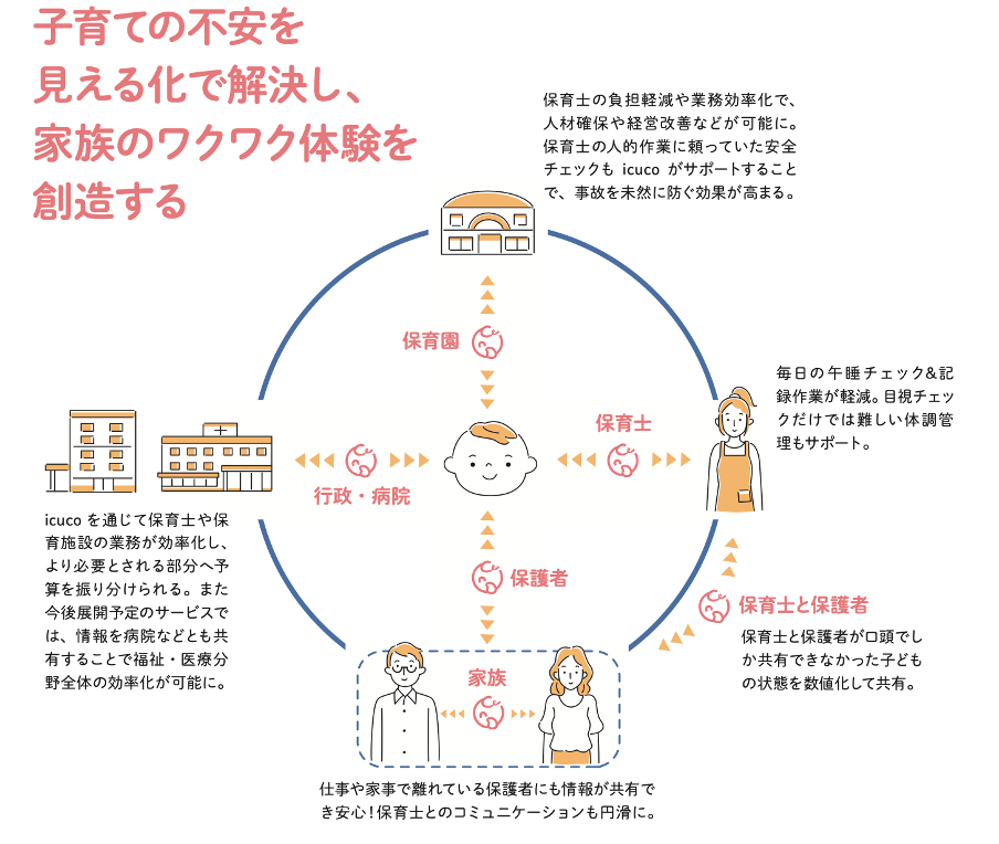 icuco®︎bookは一般的な保育園が地方自治体の補助金や金融機関からの借入に頼ったシステム導入をし、費用負担により導入したシステムを使いこなせないという現在のマーケット課題を発見し、契約更新に悩む保育所に、グローバル自動車部品メーカーが培った、高品質、低価格の量産化技術を強みとした製品及びクラウドシステムを提供しています。icucoは保育領域をはじめとする、イノベーションの到来を待つヘルスケア業界においてIoTとクラウドの力で、人がより人間らしく働くことのできる環境構築を支援していきます。