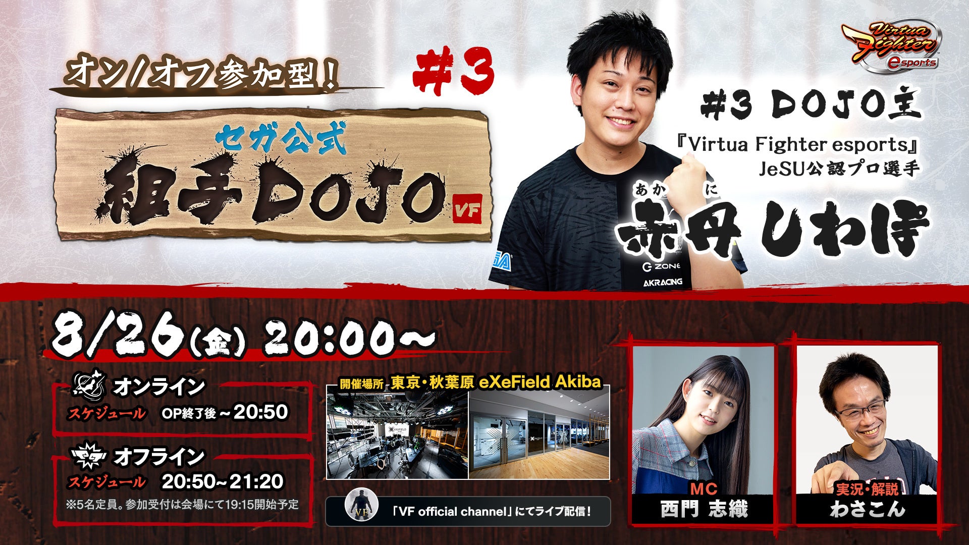 第3回目の今回、秋葉原UDX 内の「ICT×e スポーツ」を通じて新しい文化・社会を創造する交流施設「eXeField Akiba(エグゼフィールド アキバ)」にて、『Virtua Fighter esports』のプロ選手である赤丹しわぽ選手をDOJO主として開催いたします。組手に挑戦し、赤丹しわぽ選手に勝利した選手には特別称号「道場破り」をゲーム内にて配布いたしますので、挑戦者としてのご参加もお待ちしております。