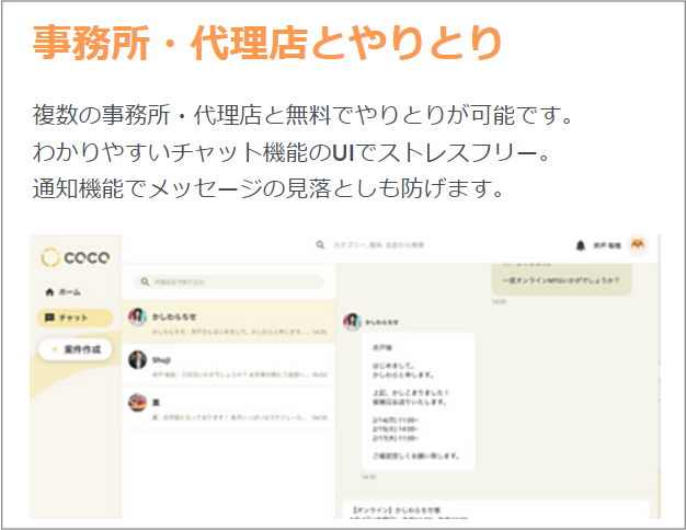 複数の事務所・代理店と無料でやりとりが可能です。わかりやすいチャット機能のUIでストレスフリー。通知機能でメッセージの見落としも防げます。