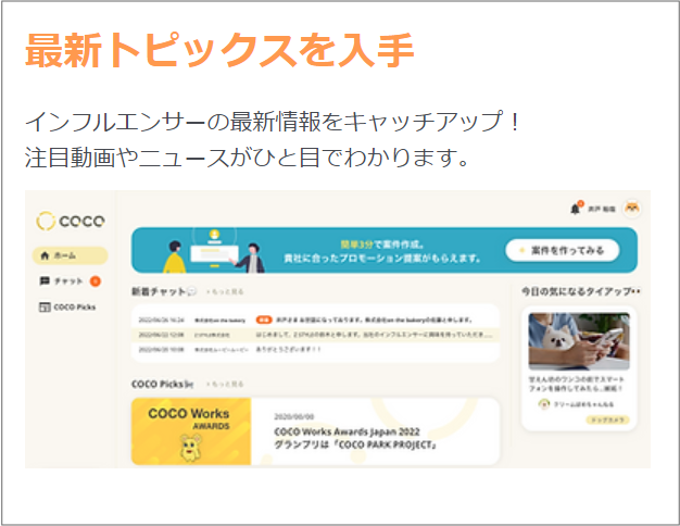 当社は、代表自身が、YouTuberを起用したプロモーションセールス経験、動画SNS業界における企業との共催企画の実績を活かし、SNS・インフルエンサープロモーションの業界全体の発展に貢献するため「COCO PARK」を開発しました。