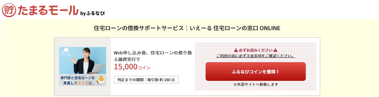 株式会社アイモバイル(本社:東京都渋谷区、代表取締役社長:野口哲也、東証プライム市場)が運営する「たまるモール by ふるなび」( https://furunavi.jp/tamaru/ 以下、たまるモール)は、iYell株式会社が運営する「住宅ローンの借換サポートサービス|いえーる 住宅ローンの窓口 ONLINE」の掲載を開始しました。