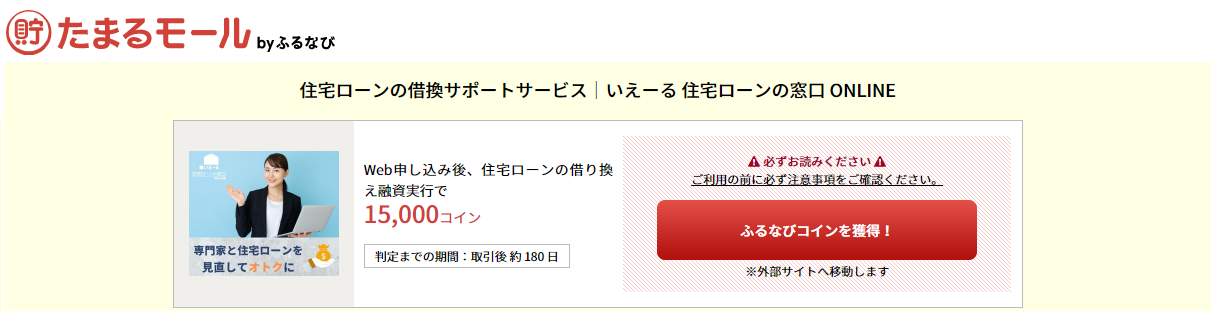 | Web申し込み後、住宅ローンの借換融資実行で 還元 : 15,000コインプレゼント 獲得条件: Web申し込み後、住宅ローンの借換融資実行 URL : https://furunavi.jp/tamaru/Advertisement/Detail?AdvertisementId=1014 |