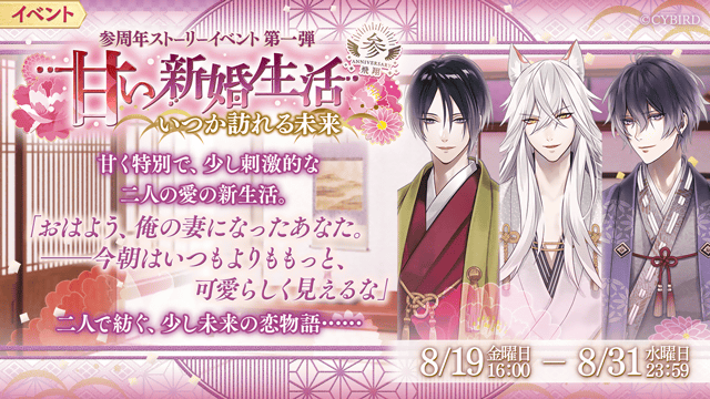 3周年を記念して、ありったけの愛を詰め込んだ「甘い新婚生活」の物語が楽しめる、ストーリーイベントが開催中!「源義経(CV:石田 彰)」・「玉藻(CV:田丸 篤志)」・「崇徳院/顕仁(CV:岩永 徹也)」の3ルートがお楽しみいただけます。