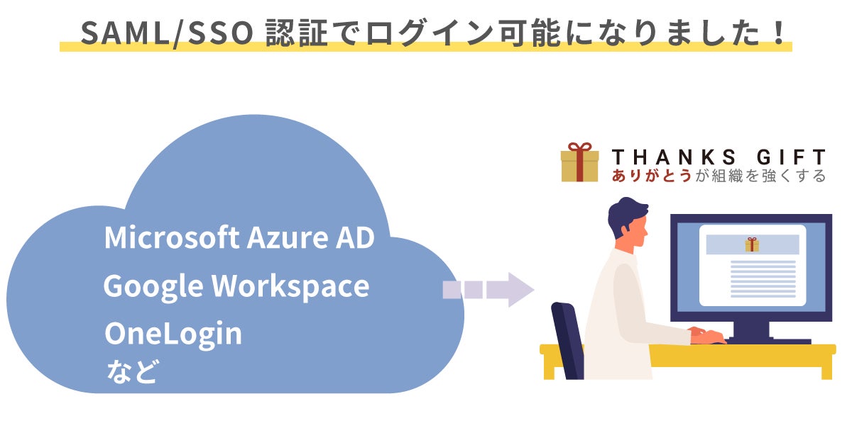 今回、SAML認証機能の追加により、Azure AD/Google Workspace/OneLoginなどの社内で利用しているIdP(Identitiy Provider)に登録したアカウント情報でTHANKS GIFTへのログインが可能になります。上記によりシステムをシームレスに活用でき、利便性の向上につながります。