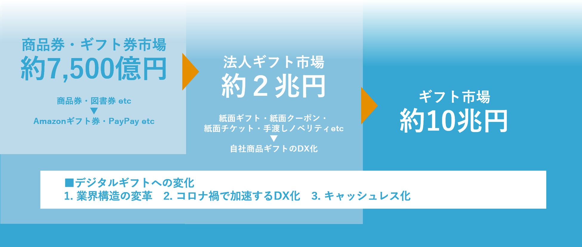 日本国内のギフト市場は約 10 兆円と言われており、当社はその中でも、商品券・ギフト券などの金券市場がターゲット市場にあたると捉え、金券市場からギフト市場全体を掌握していくこととしてサービスの開発・改善を推進しております。