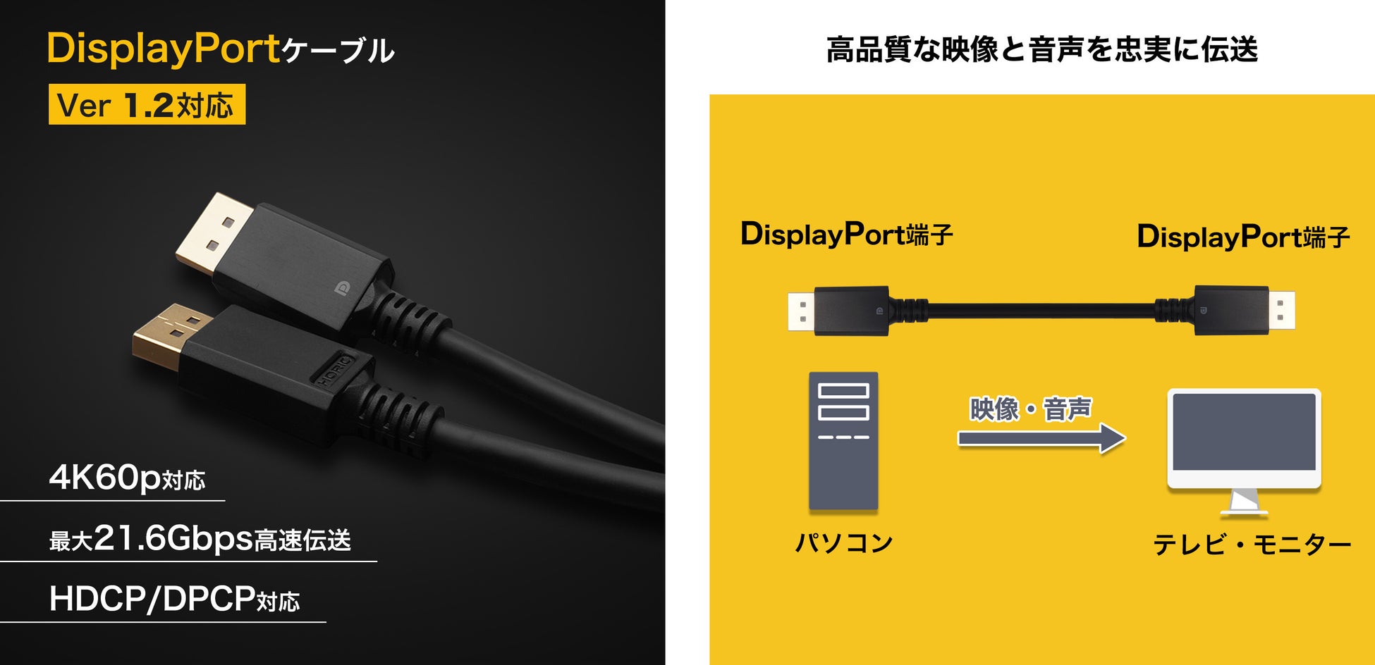 最大21.6Gbpsの伝送速度に対応したDisplayPort規格ver.1.2ケーブルです。