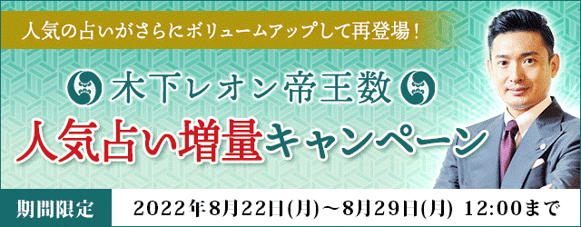 フジテレビ系列で放送中の占い番組『突然ですが占ってもいいですか?』で人気を博している木下レオン。ただいま、月額公式サイト『木下レオン◆帝王数』にて、『木下レオン帝王数 人気占い増量キャンペーン』を公開中です。サイト内でピックアップされた人気の占いに鑑定項目が追加され、よりボリュームアップした占いメニューとして再登場いたします。ぜひこのお得な機会にお試しください。
