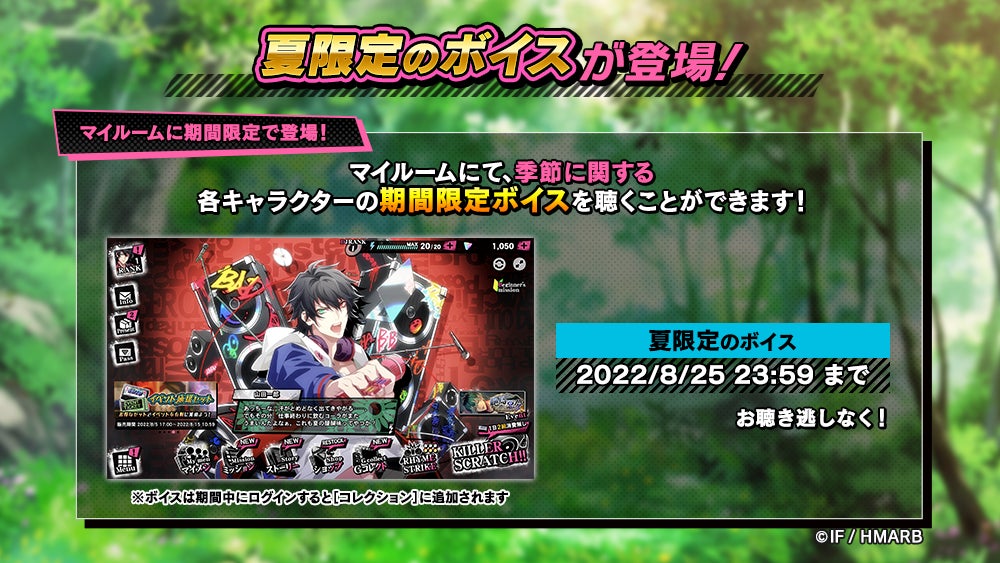 期間中、マイルームで夏をテーマにした期間限定ボイスを聴くことができます。また、期間中にログインすると該当ボイスは「コレクション」内のそれぞれのキャラクターページでいつでも視聴することが可能になります。ぜひアプリにアクセスしてみてください。
