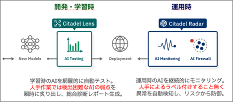開発・PoCから運用に至るさまざまなステージにおいて、AIのバイアスに起因するビジネス上・セキュリティ上のリスクを瞬時に検知し防御する、自動テストシステム 「Citadel Lens (シタデル・レンズ) 」ならびに自動モニタリングシステム 「Citadel Radar (シタデル・レーダー) 」を提供しています。