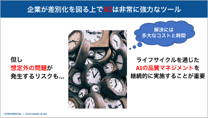 AIをビジネスや社会で最大限有効活用するためには、開発の瞬間だけではなく、継続的に見守り、学習を重ね、育てて行く、「ライフサイクルを通じたAIの品質マネジメント」を実施することが重要です。