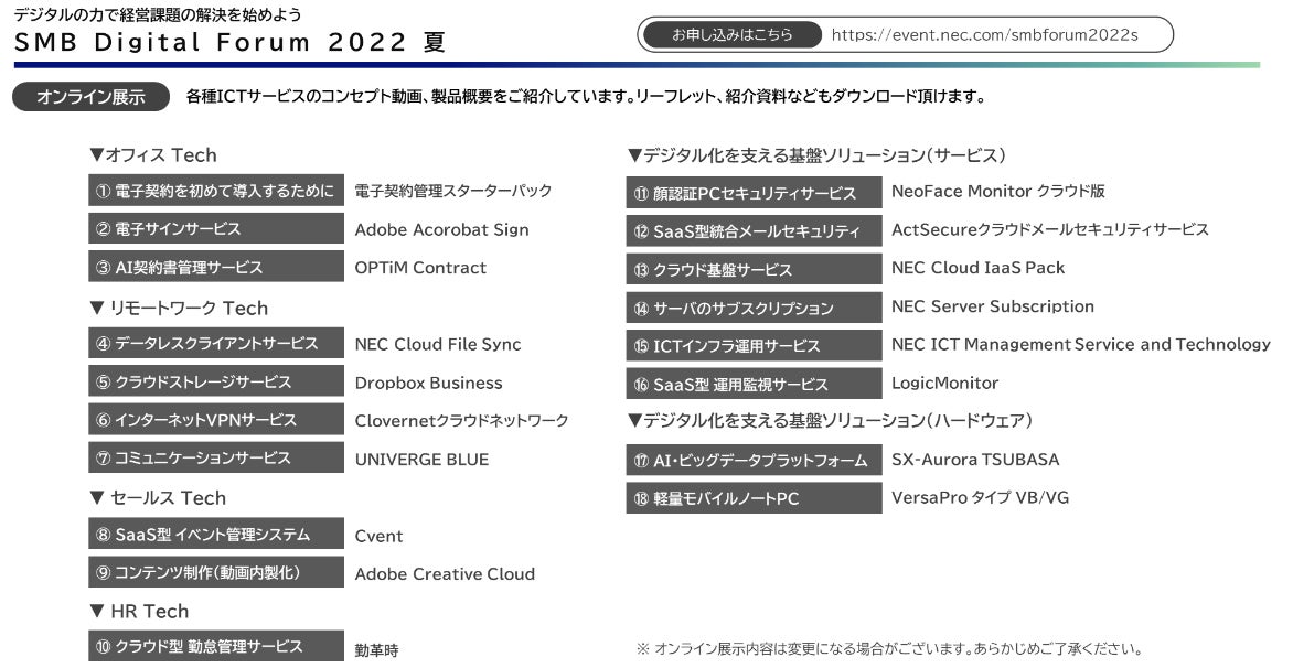 本イベントでは各セミナーセッションに加え、オンラインイベントページ上で展示コーナーをご用意しています。 各製品サービスのご紹介資料、リーフレットなどのツールのダウンロードから、各製品サービスの概要が分かるご紹介動画までをご用意いたします。