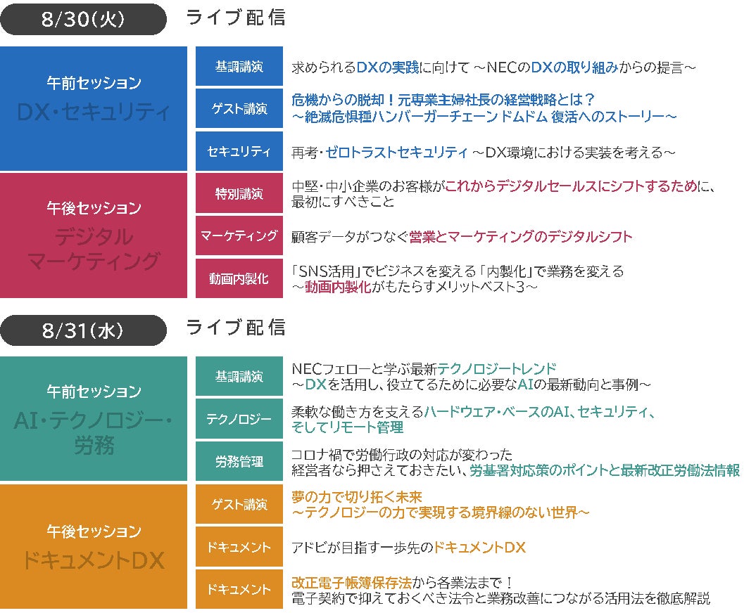 NECでは、デジタル化を推進するお客様に成果を出していただくための4つのテーマを設定。各テーマ・領域のスペシャリストをお招きして、4セッション12講演をお届けします。