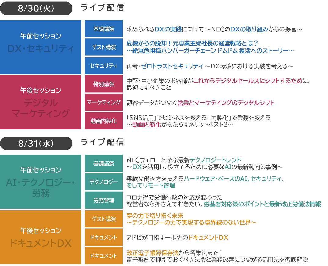NECでは、デジタル化を推進するお客様に成果を出していただくための4つのテーマを設定。各テーマ・領域のスペシャリストをお招きして、4セッション12講演をお届けします。