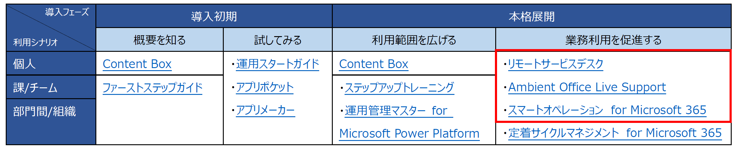 「Power Platform」の組織への浸透・定着を意識し、フェーズ×利用シナリオに沿ってサービス提供をしています。