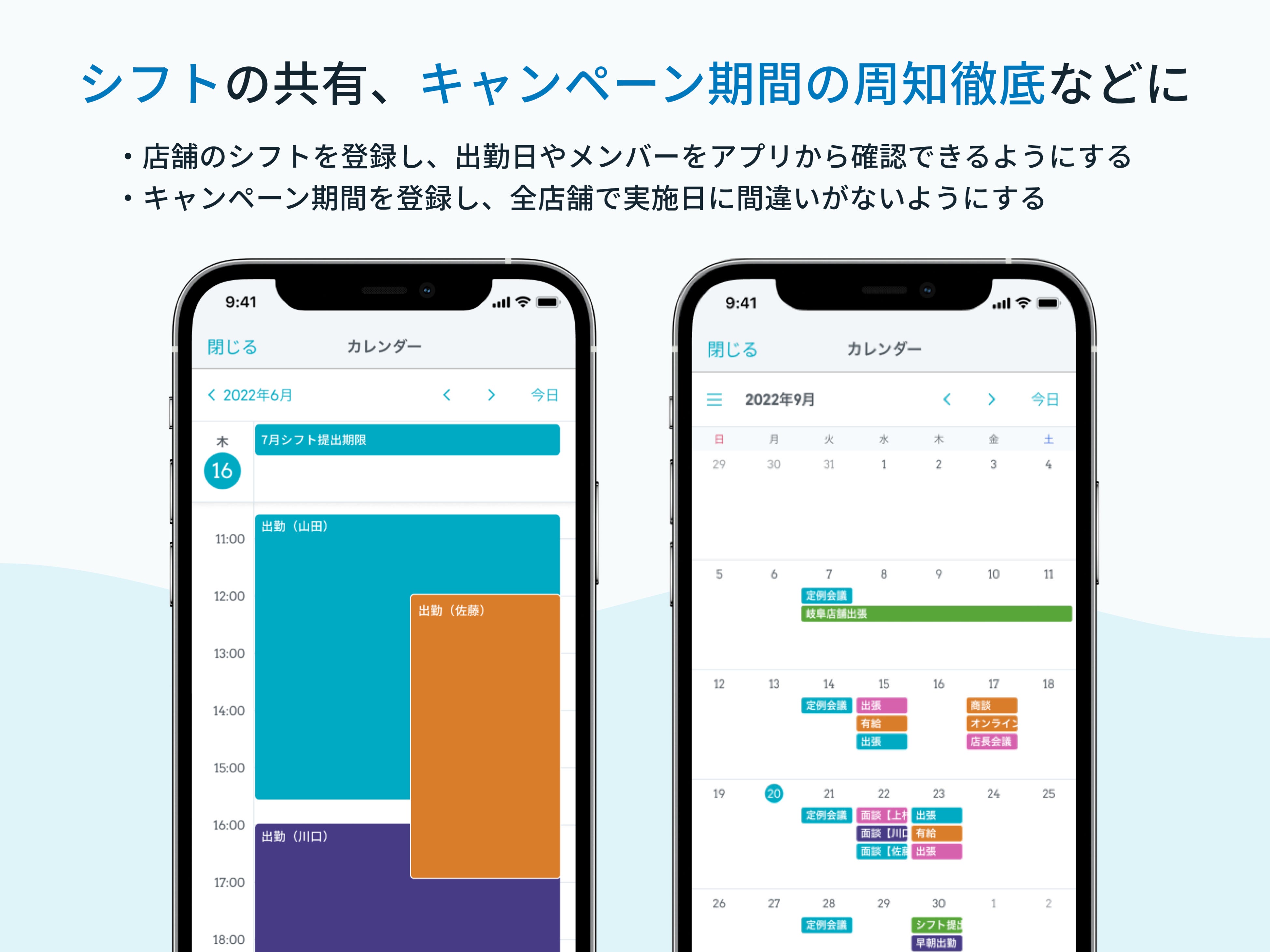 「カレンダー機能」によって、社内・店舗内の予定をスマートフォンやPCで確認したり、リアルタイムで共有したりできます。