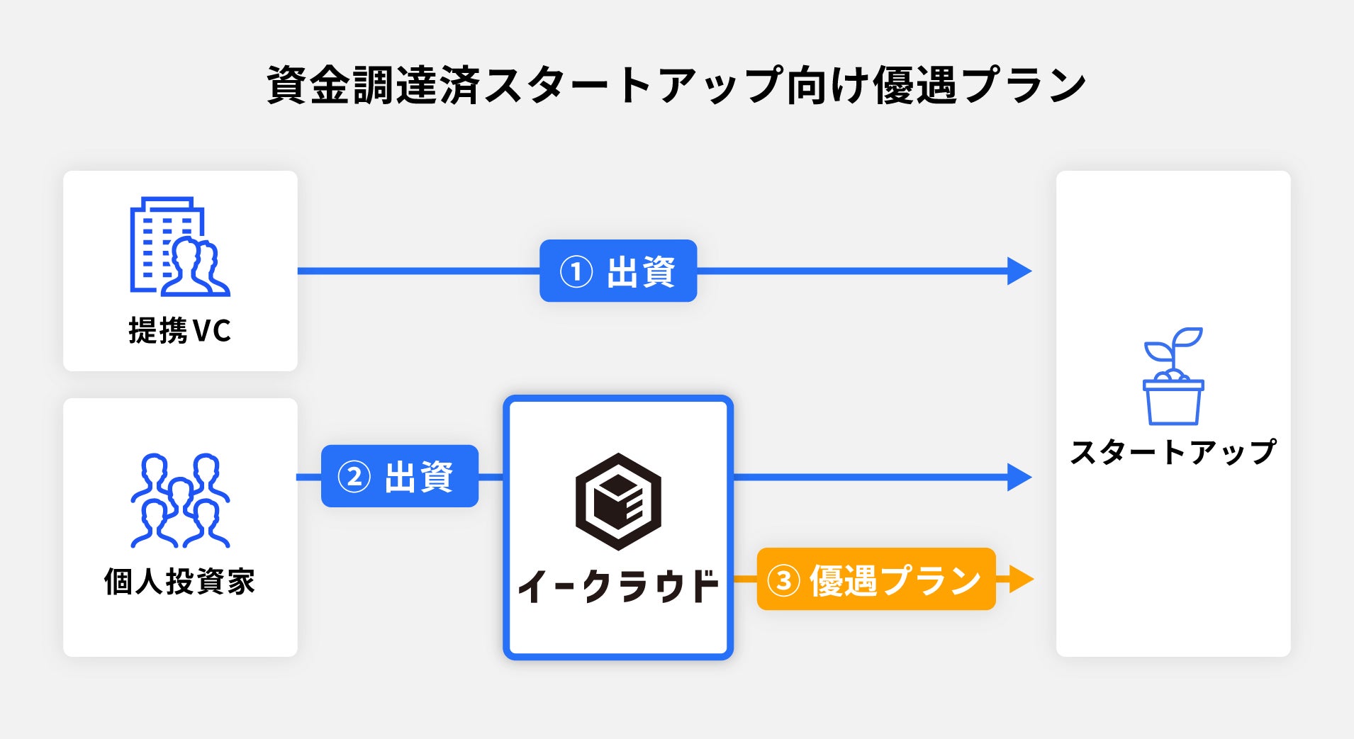 イークラウドは7月21日にスタートアップ向け優遇プランをリリースしました。イークラウドが提携するVCから出資を受けたスタートアップが、イークラウドを通じて株式投資型クラウドファンディングによる資金調達を行った場合に、優遇プランが適用されます。