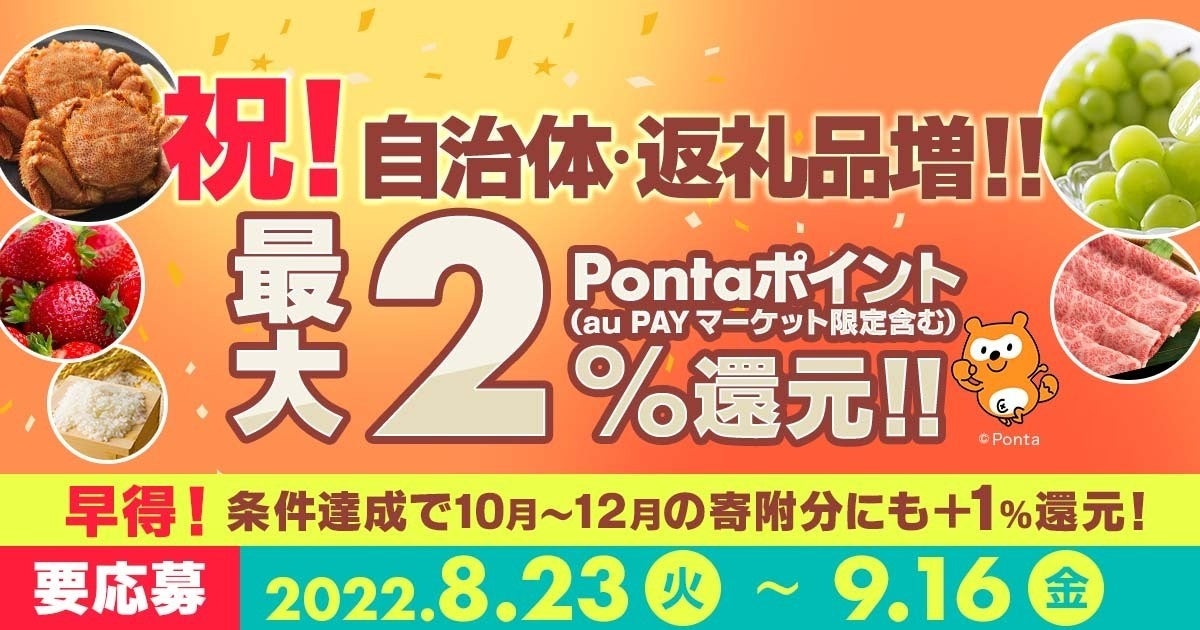 KDDI株式会社(本社:東京都千代田区、代表取締役社長:髙橋 誠、以下 KDDI)、auコマース&ライフ株式会社(本社:東京都渋谷区、代表取締役社長:尾﨑 高士、以下 auCL)は2022年8月23日から、ふるさと納税サイト「au PAY ふるさと納税」において、auスマートパスプレミアム会員を対象に15,000円以上の寄附でポイントを1%上乗せする「祝!自治体・返礼品増!!キャンペーン」(以下 本キャンペーン)を実施します。