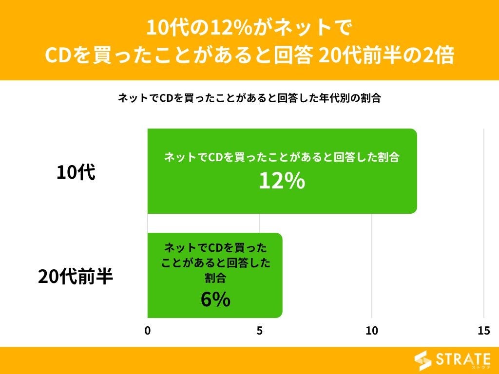 ネットでCDを買ったことがあると回答した割合を年代別でみてみますと、10代が12%、20代前半が6%という結果になりました。