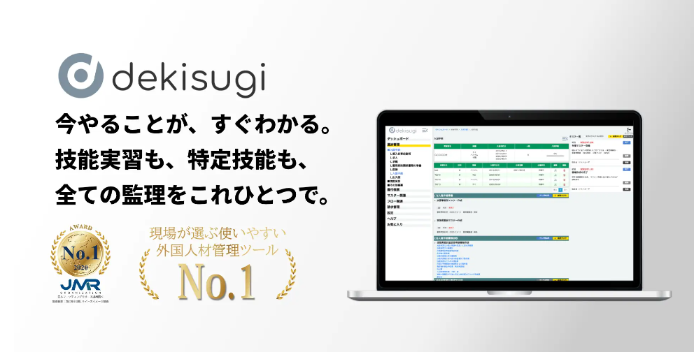 『dekisugi』(https://www.dekisugi-kun.jp/)はマスターへ情報を入力するだけで書類作成・データ管理・スケジュール管理などの一元管理が可能なクラウド型外国人材管理ツールです。