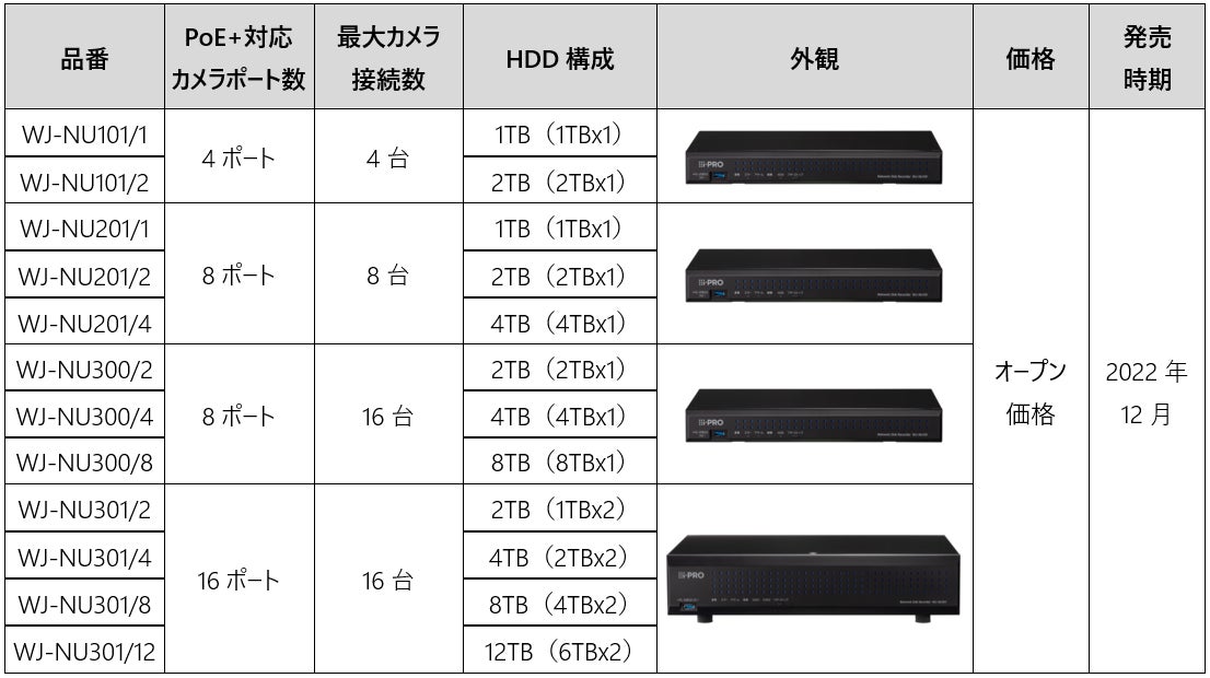 i-PRO(アイプロ)株式会社(福岡県福岡市、代表取締役社長 尾崎 祥平、以下i-PRO)は、セキュリティカメラの映像を記録/保存・モニター出力するネットワークディスクレコーダーの新たなモデルとして、NU101・201・300・301の4系統12機種を本年12月より発売します。