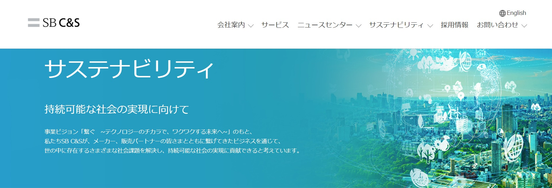 「サステナビリティ」ページでは、事業ビジョン「繋ぐ ~テクノロジーのチカラで、ワクワクする未来へ~」のもと、SB C&Sが、メーカー、販売パートナーの皆さまとともに繋げてきたビジネスを通じて、世の中に存在するさまざまな社会課題を解決し、持続可能な社会の実現に貢献できる取り組みを紹介しています。