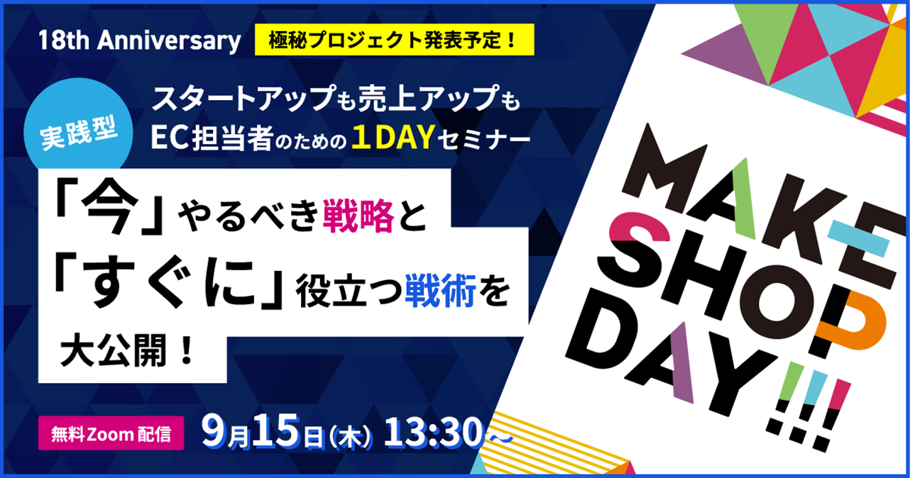 GMOメイクショップの設立18周年を記念した今回は、「今やるべき戦略と、すぐに役立つ戦術を大公開」と題し、コロナ禍により注目が高まるEC市場へこれから参入するスタートアップから、既存のEC事業において更なる売上アップを目指す事業者の方にも活用いただけるECのノウハウセミナーを開催いたします。