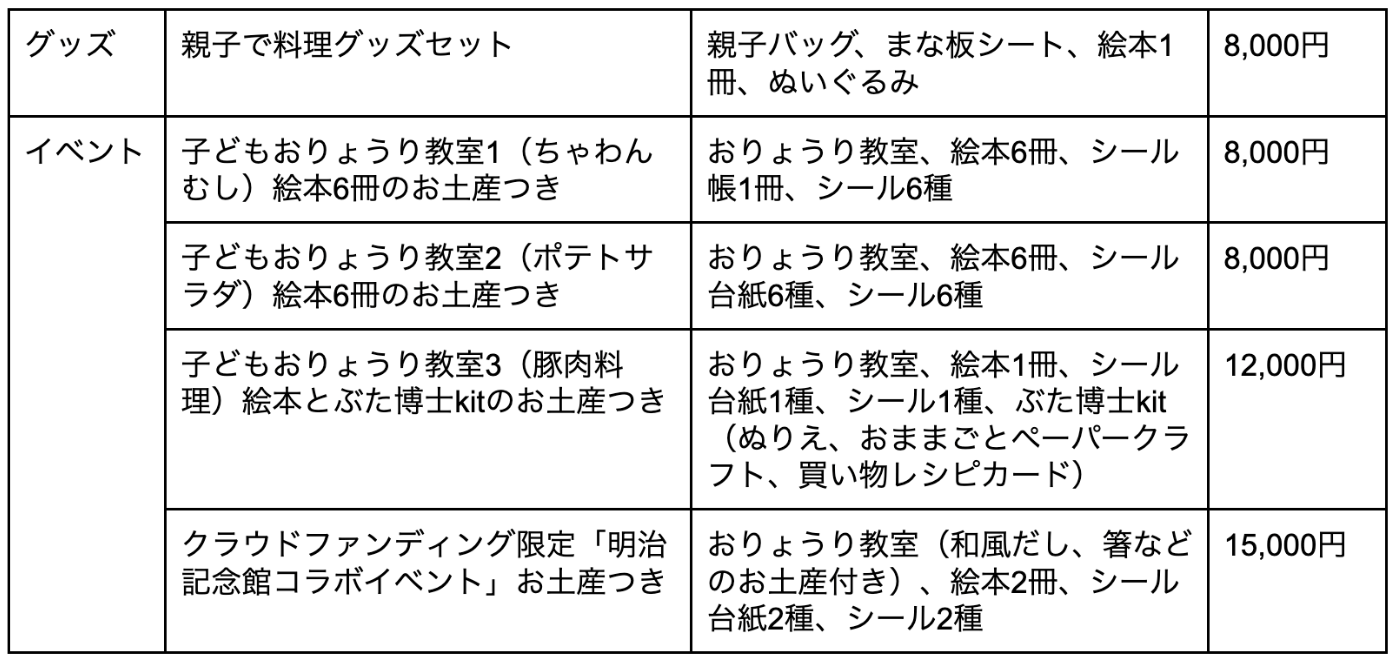 本プロジェクトでは、集まった支援をおりょうりえほんの食育活動に活かすだけでなく、返礼品として、通常サブスクリプションサービスで毎月届けている食育絵本のセットや、おりょうりえほんが主催する料理教室への参加権を、直接支援者に提供します。食育絵本やグッズは、海外在住の支援者にも届けることが可能です。