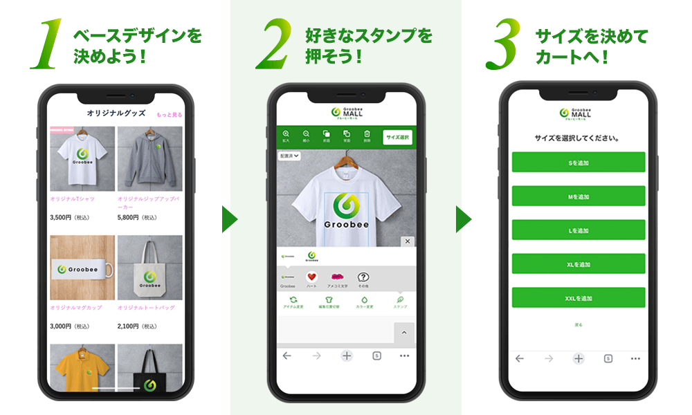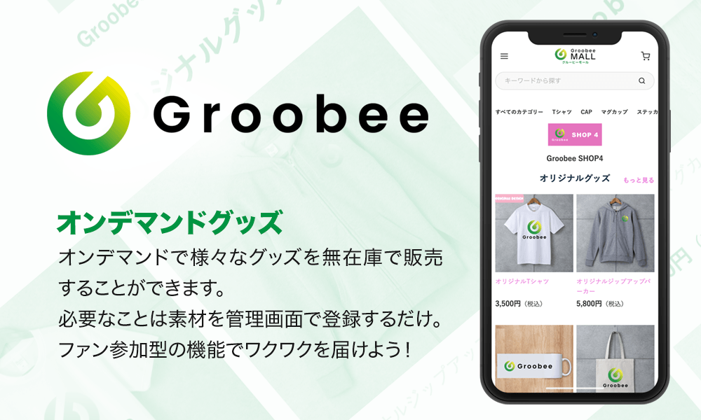 Groobeeはオンデマンド機能を搭載することでECサイトを開設したECオーナーやサイトを利用するファンは数百種類からベースとなるアイテムを選択し、ECオーナーが用意したスタンプを自在に動かし配置することで、好きなデザインのグッズ製造ができます。オンライン上で制作したオリジナルグッズは、即日製造が可能で、製作・注文から最短で翌日に出荷できます。在庫リスクを0でグッズの販売ができるため、ECオーナー側がスタンプとなる素材を変更するだけで新商品の展開が可能になります。