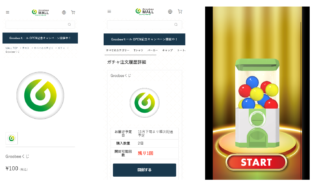 そこでGroobeeでは独自のエンタメガチャ機能を実装することでランダム商品の在庫管理、演出などを一気通貫で管理することを実現しました。これによりクライアント企業の別ツールを導入する煩雑さと、ユーザーの登録等の手間を解消します。