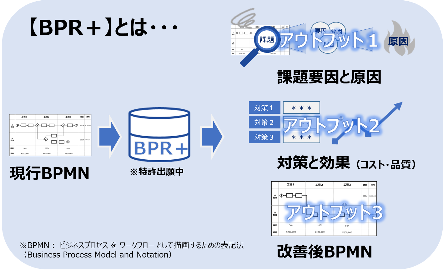 現行のBPMN(業務フロー)情報をシステムにインプットすると、オートメーションで3つのアウトプットがされます。