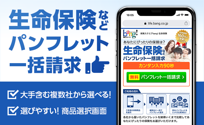 生命保険などパンフレット一括請求サービス「保険スクエアbang! 生命保険」では、一度の情報入力で複数の保険会社から死亡保険、医療保険、がん保険、学資保険、認知症保険、年金・積立などさまざまなパンフレットを取り寄せることができます。また、保険ショップで取扱いのない、全労済や共済のパンフレットも一括で取り寄せることができます。