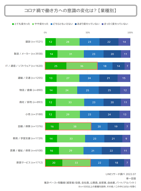 有職者*を対象に業種 (勤務先の会社・組織の主な内容) 別にコロナ禍での働き方への意識の変化についてみていきます。