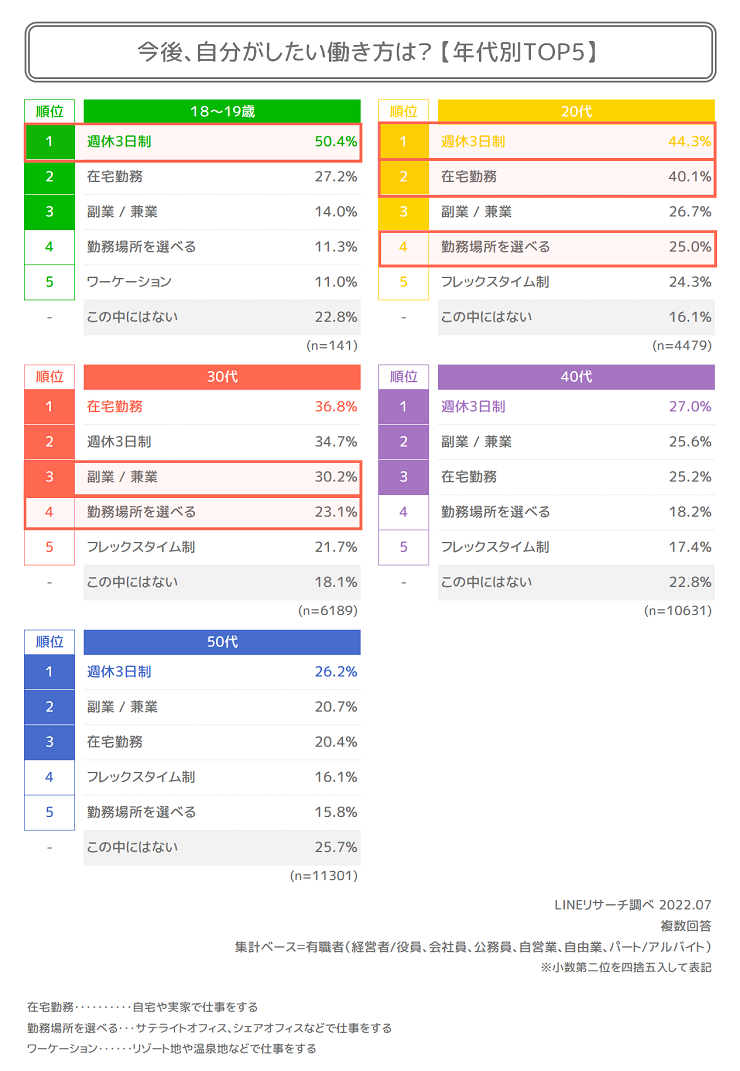 年代別でみると、10~20代では「週休3日制」が1位でそれぞれ約4割~5割となっています。特に男女18~19歳、女性20代で割合が高く5割前後でした。