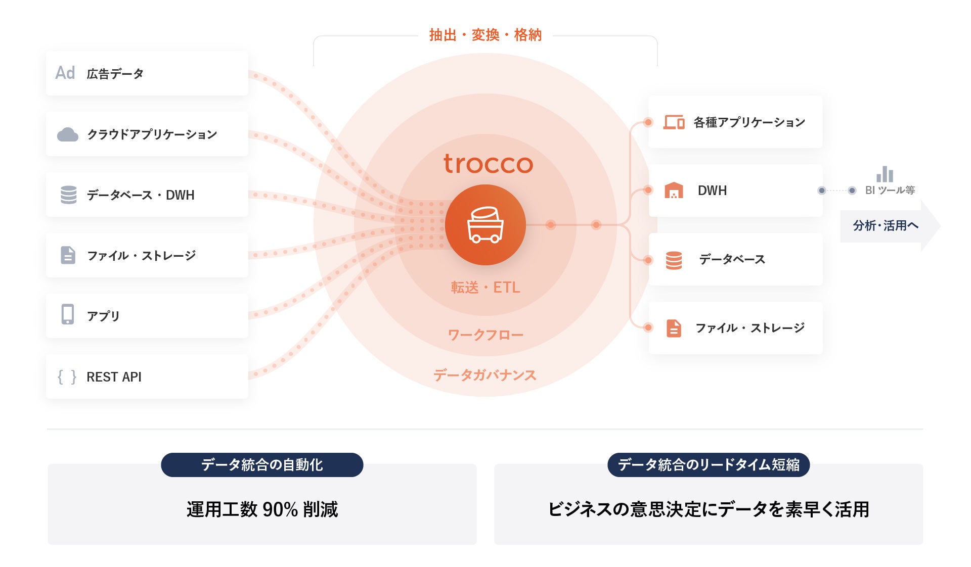 多くの日本企業にとってデータ活用は喫緊の課題です。しかしデータは大容量で形式も様々、かつ複数の場所に散らばっているためそのままでは活用できず、まずは前準備として「統合」する必要があります。一方、多くの企業において、希少なエンジニアが「データ統合」を手作業で行っており、非効率的です。こうした課題を解決するのが「trocco®」です。