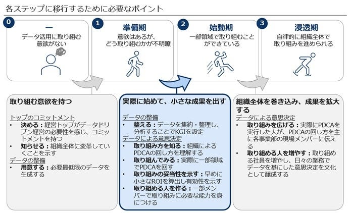 データ時代にふさわしい生産性を持つ企業にアップグレードするためには、データを基に、精度の高い意思決定をし、事業を発展させるデータドリブン経営が必要です。その実現までには、大きく分けて、3つのステップがあり、それは①トップのコミットメントから始まる「準備期」、②データの整備がされ、一部組織がデータによる意思決定ができるようになる「始動期」、③自律的に全組織がデータによる意思決定ができる「浸透期」です。