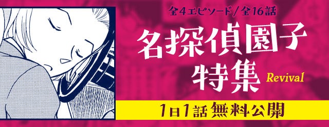 本特集では、園子が眠らされて事件を解くエピソードをピックアップした「名探偵園子特集 Revival」を実施します。「名探偵コナン公式アプリ」内にて、全4エピソード16話を、1日1話無料でお読みいただけます。プレミアムクラブ会員の方は、公開された話は期間中いつでも無料購読できます。 また、会員ではない方も期間中、第5巻の「山荘包帯男殺人事件」と各エピソードの1話目は、公開後いつでも無料購読できます。