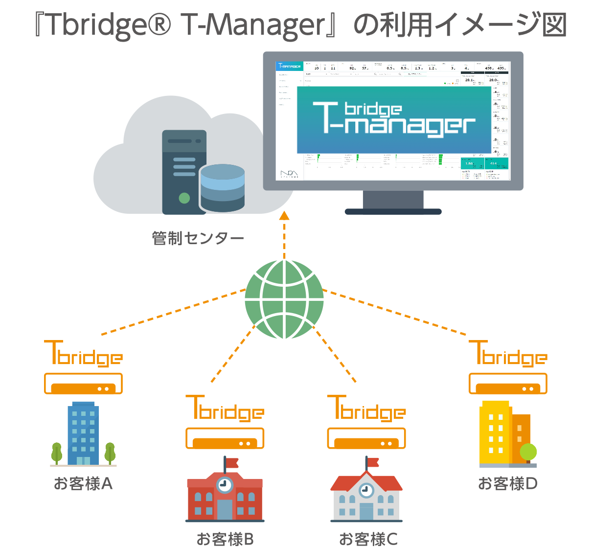 管理者が通信センサーとして設置した『Tbridge®』本体の状態を監視、設定することが可能で、ファームウェアのアップデートなどを本製品側から一斉に実行、適用することができる