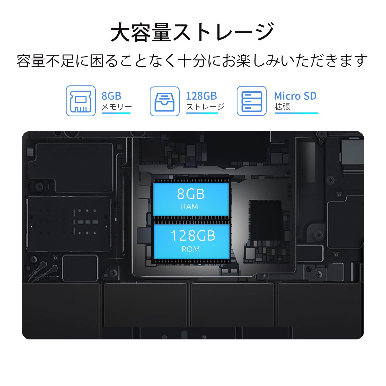 8GBのランニングメモリと128GBの高速ストレージを搭載、ストレージに拡張可能なMicroSDをサポートしています。メモリ容量が大きいとタブレットはサクサク動くようになります。Webサイトや動画を見たり、重いアプリや高画質のゲームを楽しみいただきます。