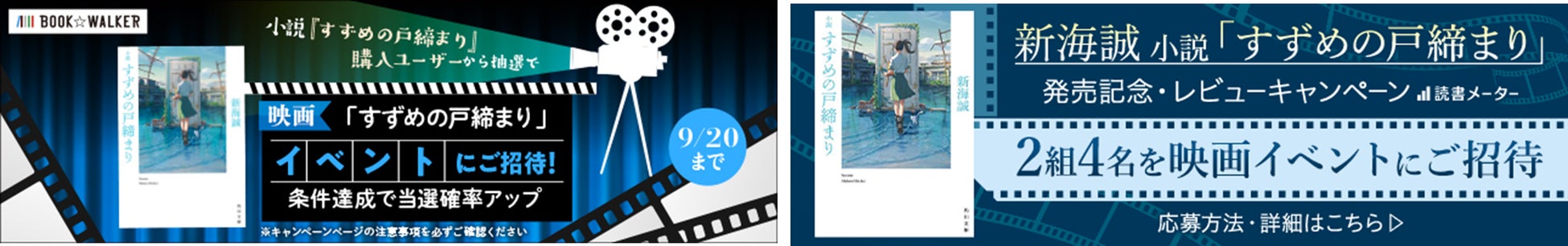 BOOK☆WALKERにて、期間中に『小説 すずめの戸締まり』(角川文庫)を購入し、キャンペーンにエントリーした方の中から抽選で3組6名の方を、10月下旬に東京都内某所で開催予定の映画『すずめの戸締まり』イベントにご招待いたします。