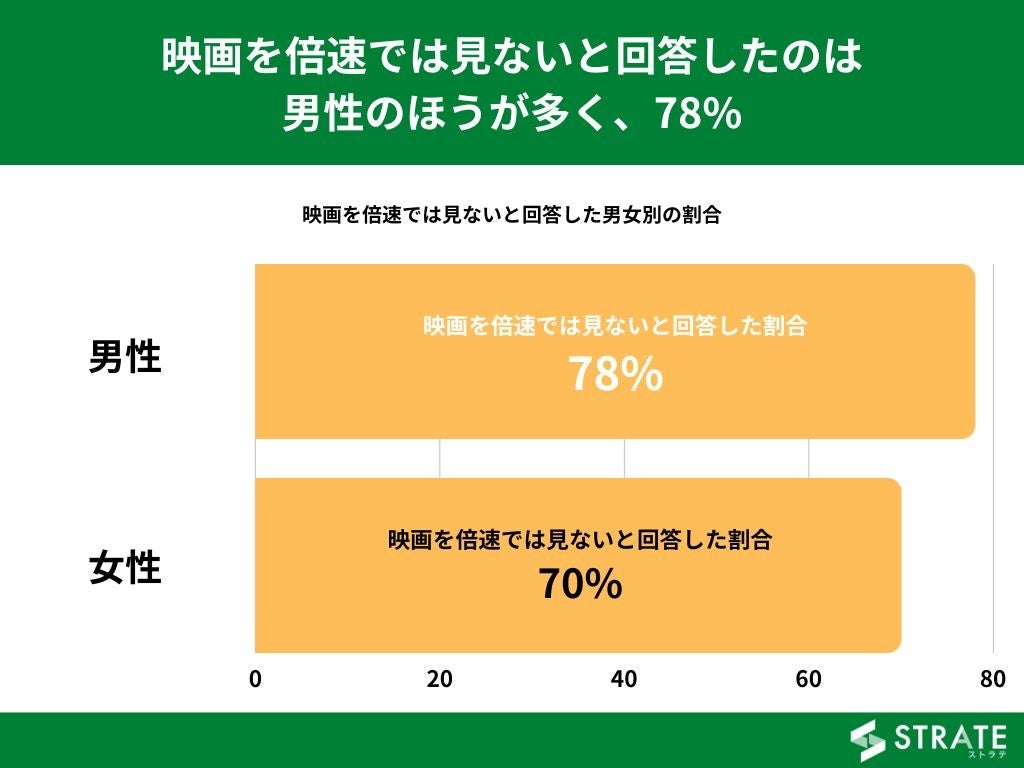 映画を倍速では見ないと回答した割合を男女別でみてみますと、男性が78%、女性が70%という結果になりました。