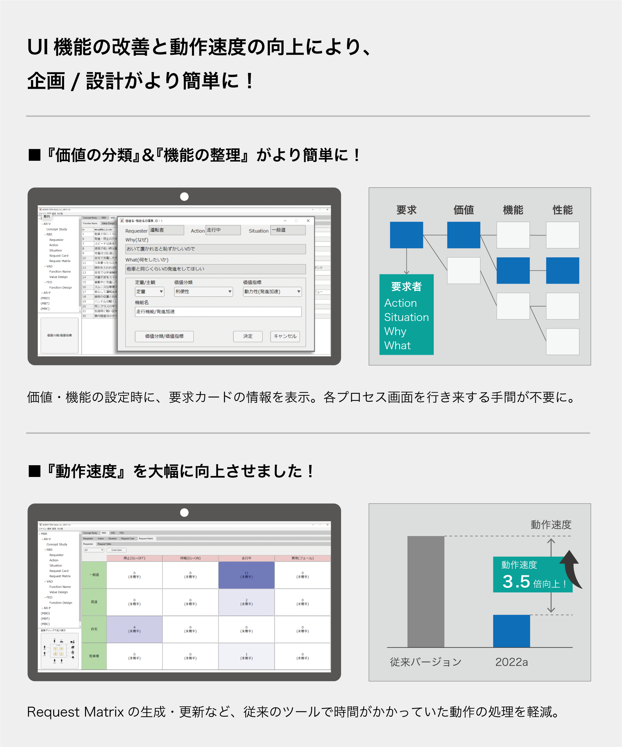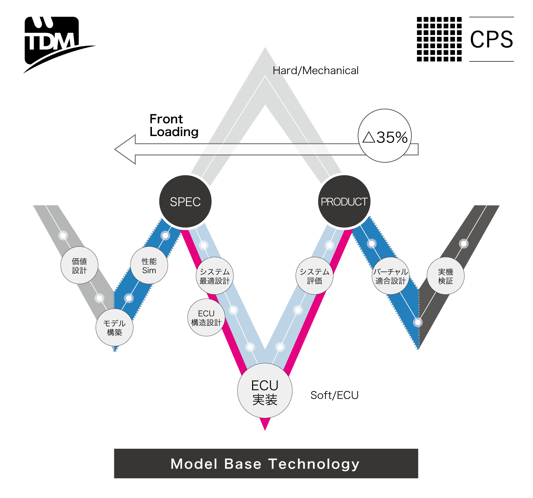 TDMは、消費者視点での不明瞭な要求を基に、効率的な価値設計を実践するための開発プロセスです。システムデザインの段階で、消費者の潜在的欲求にインパクトを与える価値指標を定量化し、システム仕様を明確なモデルで表現。シミュレーションを駆使して、設計したシステムの効果と実現性を迅速に検証します。様々な設計案を試し、実現可能な最も価値のある設計を繰り出す支援環境だといえます。TDMでは、精緻な仮説検証を実施するため、経済産業省モデリングルールに準拠した、機能や性能の統合インターフェースを提供し、システム全体の性能をシステムデザインの段階で正確に検証できるようにしています。設計の初期に機能や性能を確定的に分配できれば、後戻りの発生を減らせると同時に、後工程の詳細設計も自動化しやすくなります。