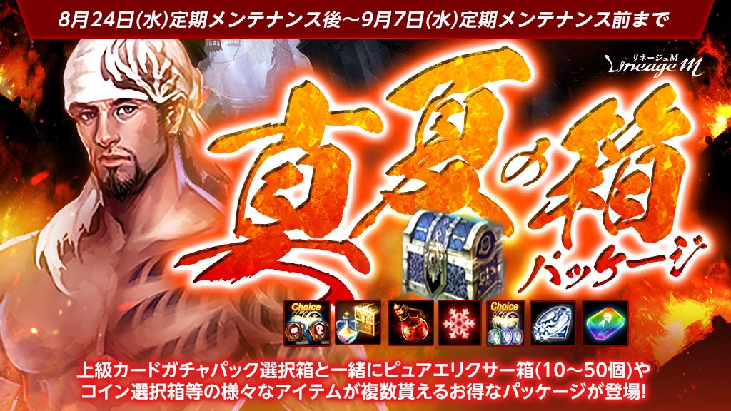 「ドラゴンのダイヤモンド」と一緒に「上級カードガチャパック選択箱」と「コイン選択箱」「ピュアエリクサー箱(10~50個)」等の様々なアイテムが獲得できる「真夏の箱パッケージ」が登場しました。