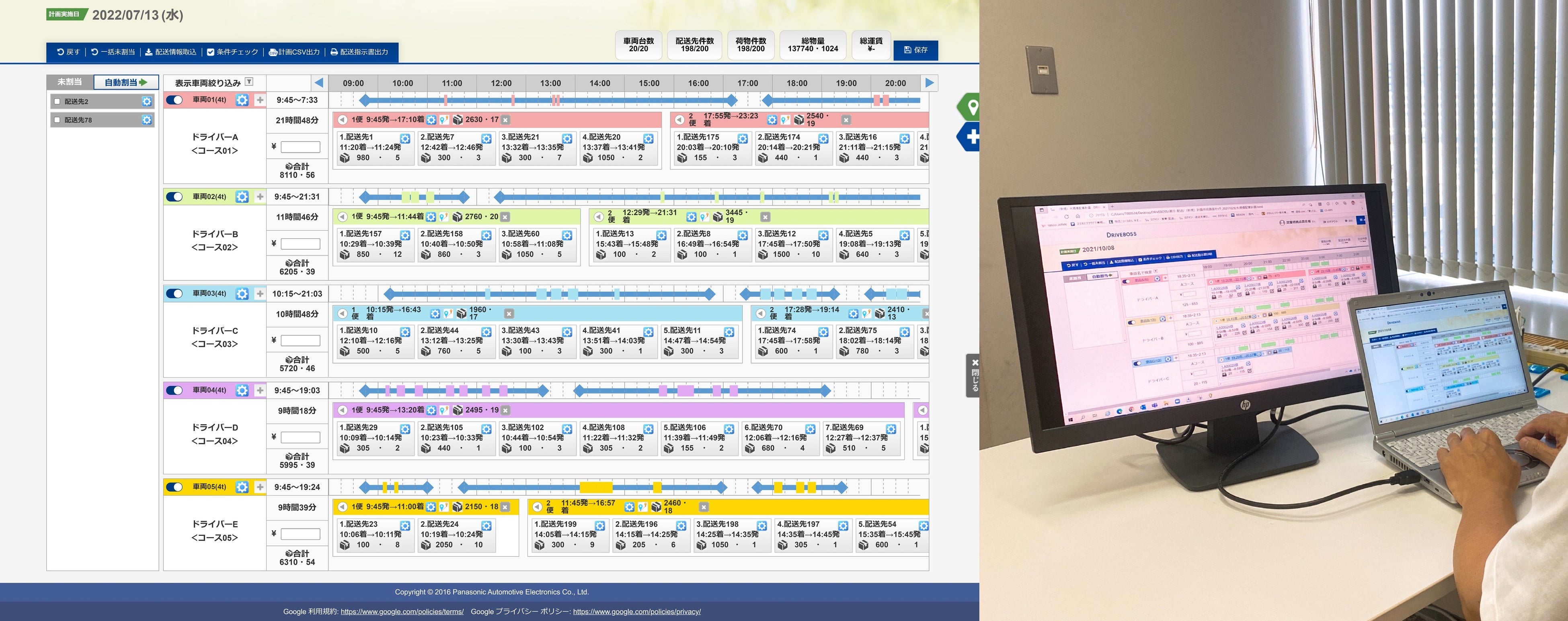 これに対応して、DRIVEBOSSは、PCEが介護業界でのデイサービスの送迎業務の効率化で培ってきた効率配車AI技術をさらに強化することで、延着・早着(待機時間)を防止する配送時間帯を守りながら、限られた車両数とドライバー数でより効率的に配送・巡回業務が行えるようになります。