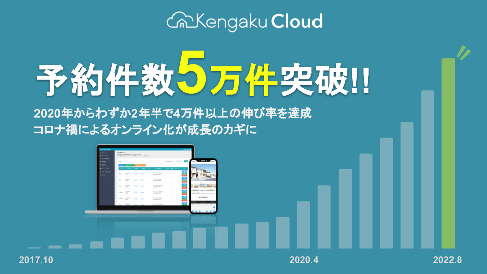 「ケンガククラウド」は、工務店や住宅メーカー、リフォーム・リノベーションなどの住宅業界に特化した予約集客クラウドツールです。2017年10月のサービス開始以降、利用企業と累計予約件数を急速に伸ばしており、2022年8月に累計予約件数が5万件を突破いたしました。背景として、これまで予約不要で来場者を受け入れていた住宅見学会・展示会がコロナ禍によって完全予約制に切り替えることを余儀なくされたことで、予約見学管理ツールとして利用数が伸びたことがあげられます。