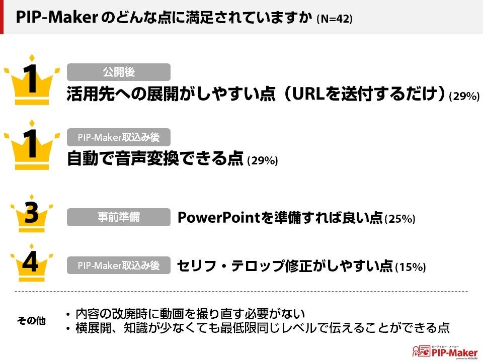 - 「メンテナンス部品問い合わせ先の変更、自分で調べる方法などをPIPで作成し、営業からお客様に説明しやすくした結果、問い合わせが大幅に削減できた。」
