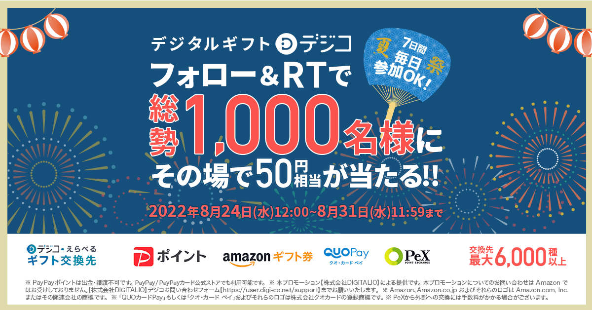 期間中、デジコ公式Twitterアカウント( @DigicoOfficial )をフォローし、対象ツイートをリツイートして指定のURLから抽選に参加すると、総勢1,000名様にデジタルギフト「デジコ」が当たるキャンペーンです。